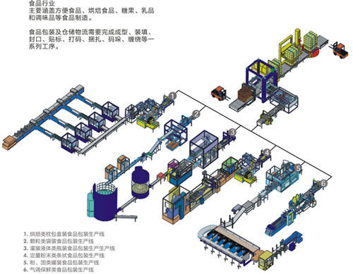 食品包裝及倉儲物流需要完成成型、裝填、封口、貼標、打碼、捆扎、碼垛、纏繞等一系列工序。 烘焙類枕包盒裝食品包裝生產線 顆粒類袋裝食品包裝生產線 灌裝液體類瓶裝食品包裝生產線 定量粉末類條狀食品包裝生產線 粉、固類罐裝食品包裝生產線 氣調保鮮類食品包裝生產線